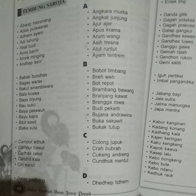 Ajining dhiri, gumantung kedhaling lathi. Sakjeke aku nderek gusti, uripku tansah diberkahi. Dijupuk saka aksara dewanagari d. Dadi bocah kudu andhap asor lan sembah bekti marang bapak biyung; Sastra jawa unnes semarang ngawontênakên tumindak gladhi.